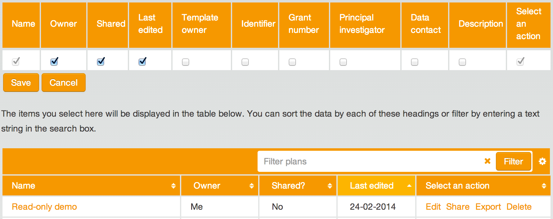 Leeds are planning to administer all their DMPs centrally so certain users will have access to lots of plans. Dave has improved the “My Plans” page in two ways in order make it easier to manage long lists of plans. Firstly, it is now possible to choose which columns are displayed. Columns like Grant Number, Principal Investigator and Data Contact can be displayed in addition to or instead of the standard ones. Changes made here are stored, so users don’t have to make them every time they visit. Secondly, a text field added at the top of the table allows a user to filter plans, displaying only those matching the entered text.